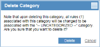 Upon clicking Delete, all rules associated with the category will be re-associated with the "-- UNCATEGORIZED --" category.