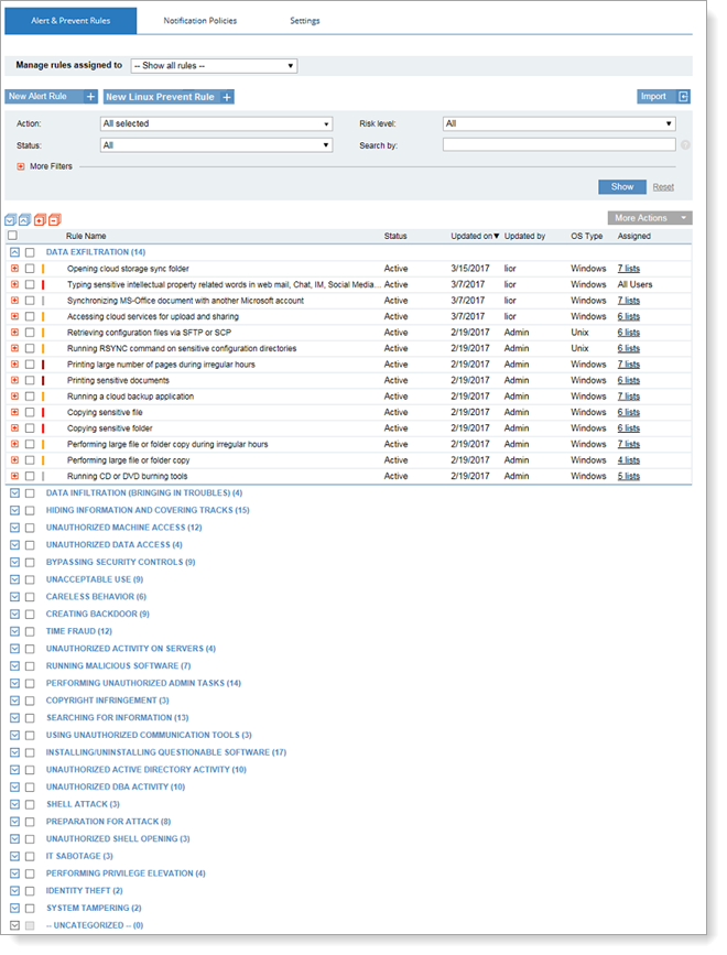 Categorization facilitates the operation and maintenance of rules and enables them to be grouped within similar security topics. Alert rules can be assigned to security Categories (such as, Data Exfiltration, Hiding Information and Covering Tracks, Running Malicious Software, Performing Unauthorized Admin Tasks, and more) in order to help navigation and facilitate rules operation and maintenance and enables rules to be grouped within similar security topics.