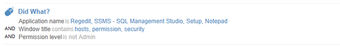 This condition specifies that every first time in a session a window title contains the word "hosts", "permissions" or "security", an alert should be generated. |