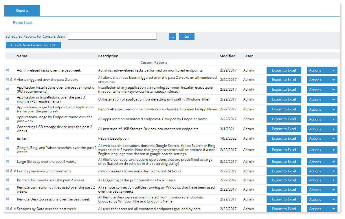 Running reports can generate additional CPU and resource usage on the SQL server holding the ITM On-Prem (ObserveIT) Database. To prevent this overhead while the server is working, you should try to run reports that might cause very large queries (such as, reports that span a long period of time) during non-working hours. To help mitigate CPU and resource usage overhead, you can view cached reports that were run previously, instead of re-running them. In the Report List, by clicking the Cached link next to a report that was previously run, you can view the report's previous results. If a report was never run before, the Cached link will be disabled.