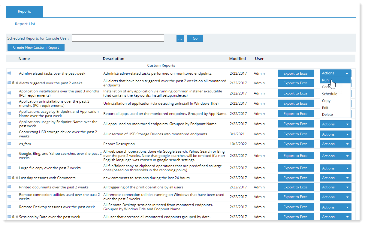 In the Reports tab, click Run from the Actions dropdown next to the report you want to run.