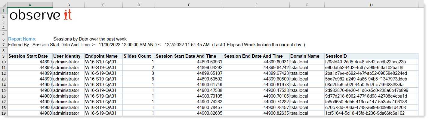 Within a short time (depending on the type and range of report), the report is generated. The results are displayed in a separate webpage, and the information can be exported to an Excel spreadsheet, as shown in the following example: