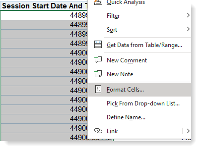 If the report includes dates, you'll probably want to reformat them. In Excel, select the column with dates. Left-click and select Format Cells from the menu.