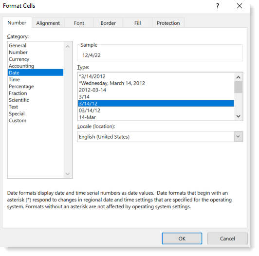In the Format Cells dialog box, select Date and choose the format you want. Click OK.