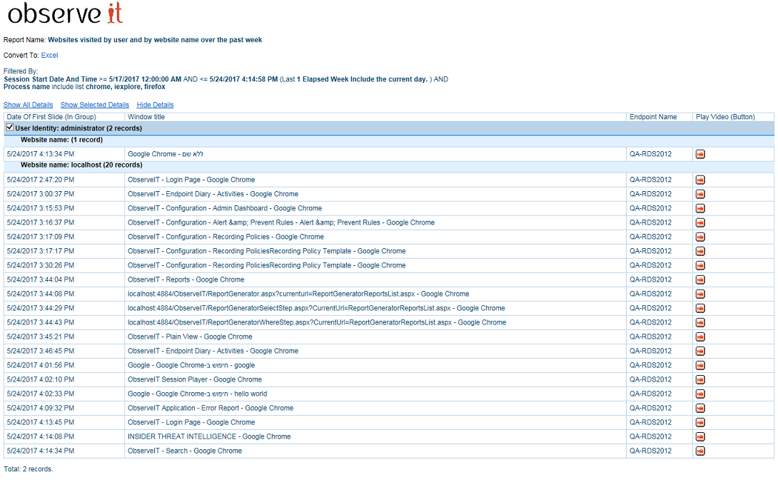 icon at the right of an entry. The ITM On-Prem (ObserveIT) Session Player opens, enabling you to see, within seconds, the applications that were used, the actions that were performed by the user, and the relevance of the session to your troubleshooting process. In addition, you can see any alerts that were generated during the session (see Viewing Alerts in the Session's Video).