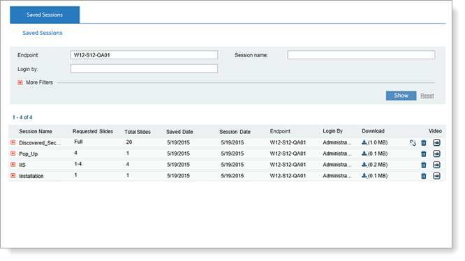 After you have defined your search criteria, click Show to display a list of Saved Sessions list according to your selected criteria. To revert to the previously filtered display, click Reset.