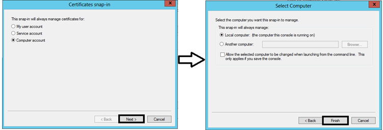 Select the Certificates snap-in, click Add, and assign it to the local computer account (Computer Account -> Local Computer).