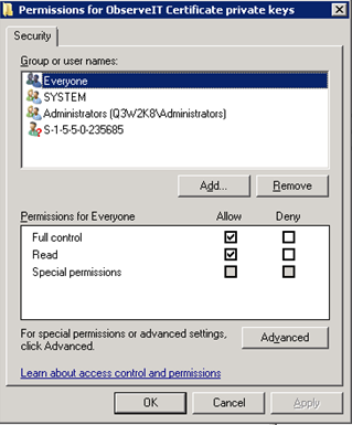 Grant the certificate full privileges for the Everyone group.