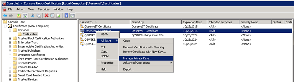 In the MMC, under Local Computers > Personal, right-click the certificate and select All Tasks > Manage Private Keys.