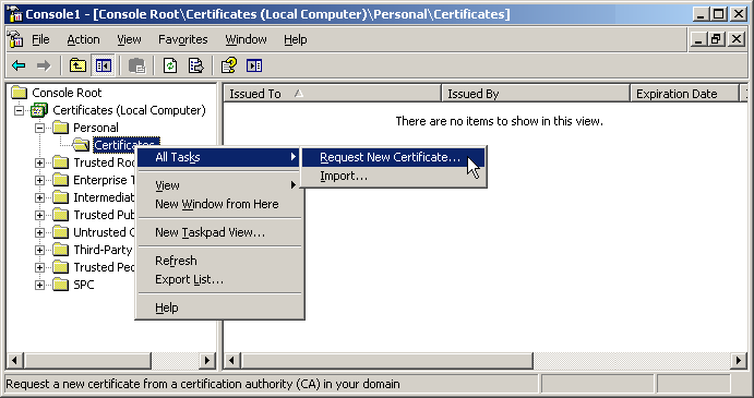 The following screen provides an example of a Digital Certificate request from a Windows Server machine to an internal Enterprise Certificate Authority.