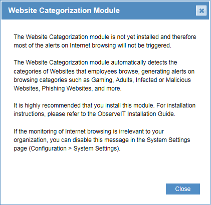 Upon logging in to any page of the Web Console, if the Website Categorization module was not yet installed and the setting Enable Website Categorization Module was not disabled in the System Settings page, the following message is displayed: