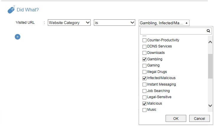 When defining conditions for alert rules in the Web Console, the Website categories that are configured after installing the module, are available for selection so that you can generate alerts when users browse the prohibited Websites.