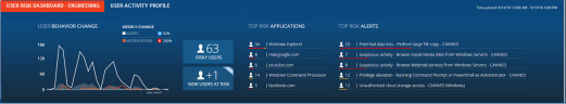The User Risk Dashboard opens by default, displaying the data that the Web Console user is permitted to monitor. If a title was defined to provide context for the scope of risky users being monitored, it will be displayed in the dashboard header. For details on how to configure a header title, see Assigning Permissions to Console Users.