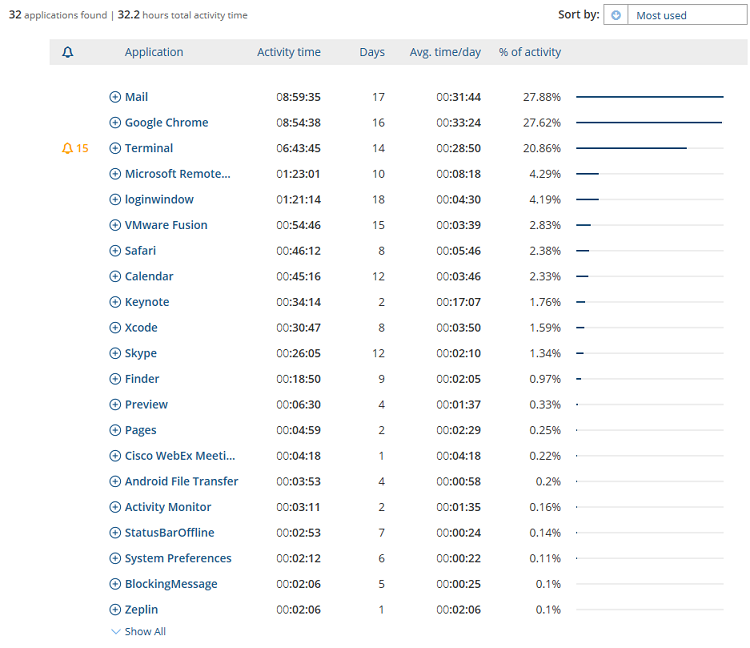 - % of activity: the percentage of user activity time spent on this application out of the total user activity time for all applications in the currently filtered query. Note that this value applies to all relevant application clips according to the currently filtered conditions. For example, if the applications are filtered by a specific computer, this time will include only the time spent interacting with the application on the specific computer (within the specified time period).