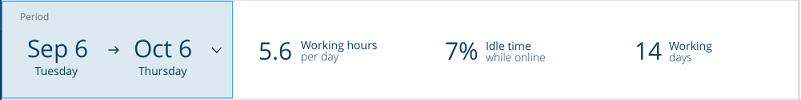 Working hours: the average number of working hours per day for the user. Working hours are calculated as the time between the first and last recorded activity on a calendar day within the selected time period, during which the user performed any activity. Time breaks during the day are considered idle time but are still counted.