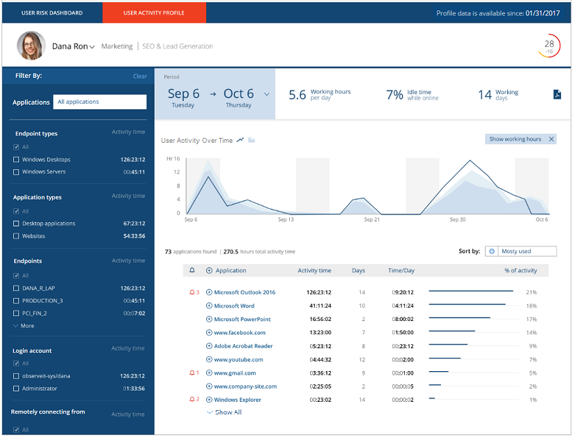 The profile period is displayed at the top right corner of the page. It shows the number of days for which the profile data is available; by default, 90 days (3 months). Profile data is collected on a daily basis from the beginning of the profile period. If the profile data collection was begun on a specific date, the displayed profile period shows when the collection of activity data began; for example, Profile data is available since: 01/31/2017.