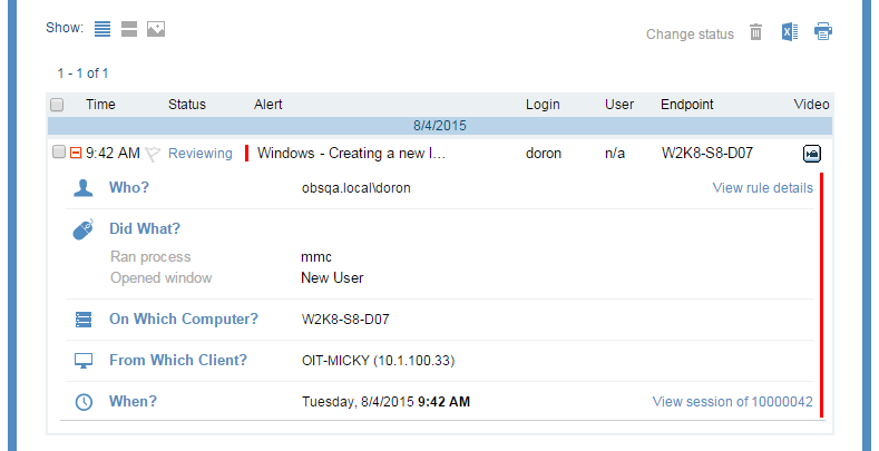 In the Alerts page of the ITM On-Prem (ObserveIT) Web Management Console, you can view the names, user risk level, and status of all generated alerts, organized by date/time and color-coded per risk level. In Details mode, you can view details of the conditions that triggered the alert; you can see exactly "Who?" "Did what?" "On which computer?", "From Which client?" and "When?". See Monitoring Alerts.