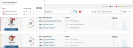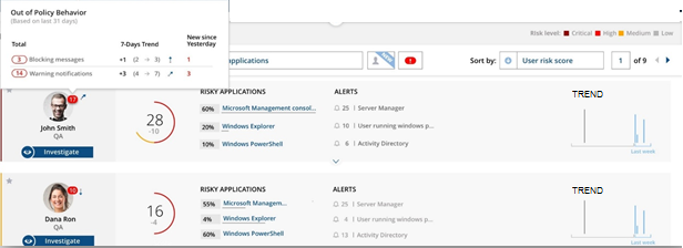 In the Risky Users section of the dashboard, next to each risky user's photo is a red tag showing the total number of out-of-policy notifications that were displayed to the user during the last 31 days. Hovering on the red tag opens a tooltip that helps you to quickly learn about changes in the user's behavior. A trend arrow to the right of the red tag indicates whether or not the user behavior has improved over time.