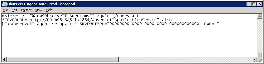 msiexec /i "%~dp0WinAgent64bit.msi" INSTALLDIR="%ProgramFiles%\ObserveIT\ObserveITAgent" /quiet /norestart SERVERURL="http://<oit_app_server_fqdn>:4884/ObserveITApplicationServer" JWTFILE="<full_path_to_jwt_file>" SRVPOLTMPL="00000000-0000-0000-0000-000000000000" /leo "%~dp0ObserveIT_setup.txt"