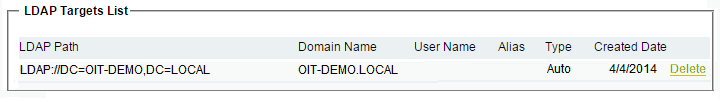 If the Domain path and credentials are valid, the connection will be added to the LDAP Target List. The LDAP Target type will be set to Auto.