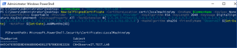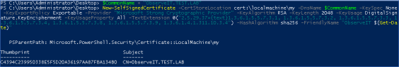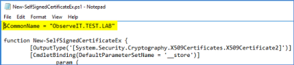 - Edit the script. In the first row, change the variable $CommonName to the FQDN of the server on which the certificate will be installed. For example: observeit.test.lab.