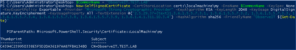 New-SelfSignedCertificate -CertStoreLocation cert:\localmachine\my -DnsName $CommonName -KeySpec None -KeyExportPolicy Exportable -Provider "Microsoft Strong Cryptographic Provider" -KeyAlgorithm RSA -KeyLength 2048 -KeyUsage DigitalSignature,KeyEncipherment -KeyUsageProperty All -TextExtension @("2.5.29.37={text}1.3.6.1.5.5.7.3.1, 1.3.6.1.5.5.7.3.2, 1.3.6.1.5.5.7.3.3, 1.3.6.1.5.5.7.3.4, 1.3.6.1.5.5.7.3.8, 1.3.6.1.5.5.7.3.9, 1.3.6.1.4.1.311.10.3.4") -HashAlgorithm sha256 -FriendlyName "ObserveIT $(Get-Date)"