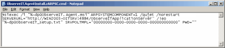 msiexec /i "%~dp0ObserveIT.Agent.msi" ARPSYSTEMCOMPONENT=1 /quiet /norestart SERVERURL="http://WIN2003-SRV1:4884/ObserveITApplicationServer" /leo "%~dp0ObserveIT_setup.txt" SRVPOLTMPL="00000000-0000-0000-0000-000000000000" PWD=""