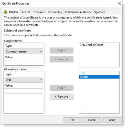 - Alternative name > Type, select DNS and type itAuth in the Value field. Click Add.