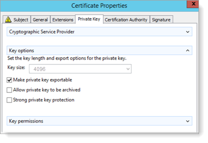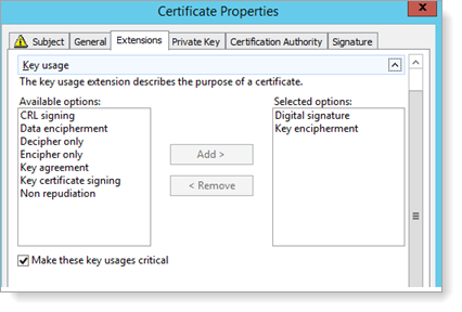 - Select Key usage and verify Digital signature and Key enciphement are Selected options.