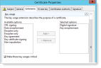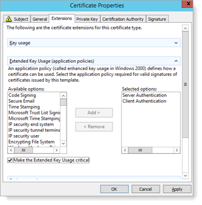 - Select Extended Key Usage and verify Server Authentication and Client Authentication are Selected options.
