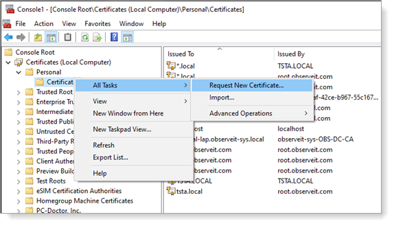 Right-click and select All Tasks > Request New Certificate.