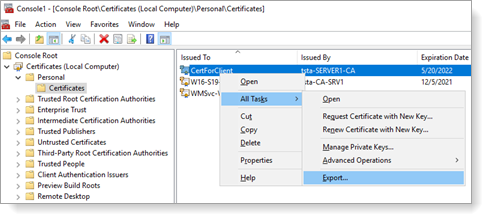 Navigate to Certificates > Personal > Certificate. Right click and select All Tasks > Export.