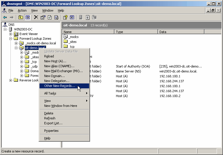 Open the DNS Management console, and expand your server name > Forward Lookup Zones. Click on the zone that is used by the Active Directory domain. For example, if your domain name is oit-demo.local, in the DNS Management console expand the oit-demo.local zone.