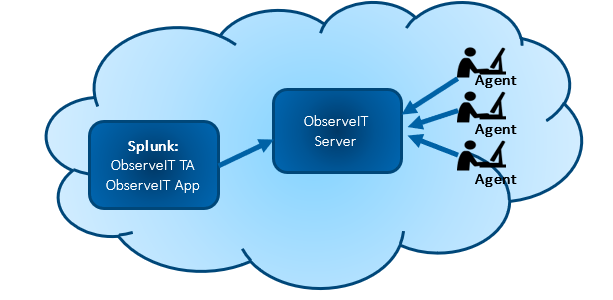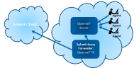 Splunk Cloud can be used to store and search for ITM On-Prem data. To forward the data to Splunk Cloud, ObserveIT TA is installed on a Splunk heavy forwarder on the same network as ObserveIT. The ObserveIT App is installed on Splunk Cloud.