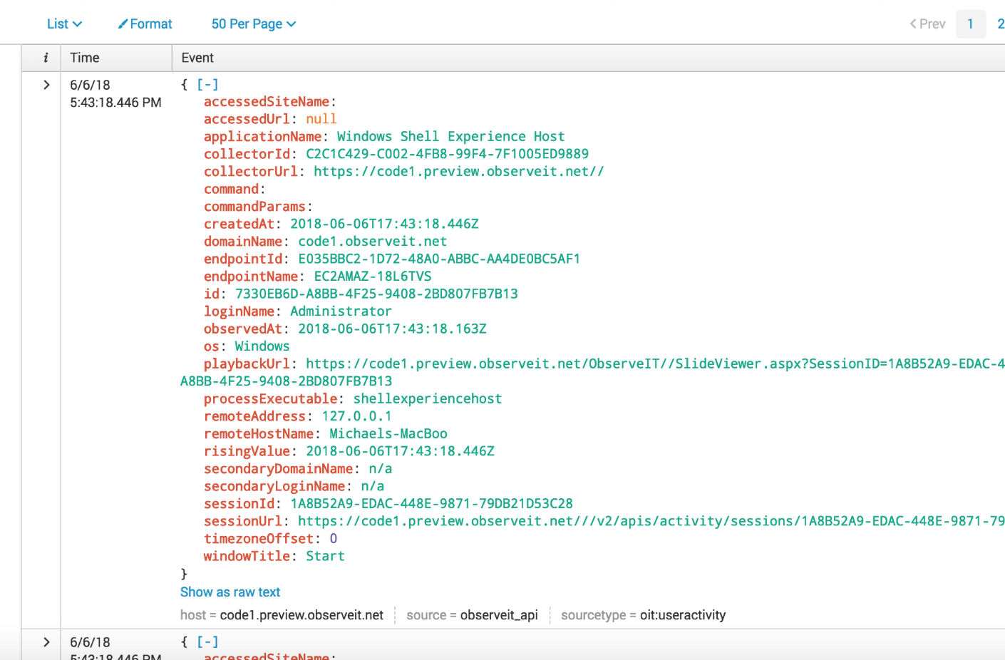 A summary view of each user session is available, including the start and end time of the session, the number of unique activities, and the user involved.
