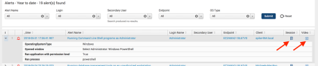 The Alerts dashboard shows the top alerts and top risky users and applications. All alerts are listed, with a link to launch the ITM On-Prem (ObserveIT) player so you can playback the user’s session. The session column lets you drill-down to the individual activities that comprise the alerted session.