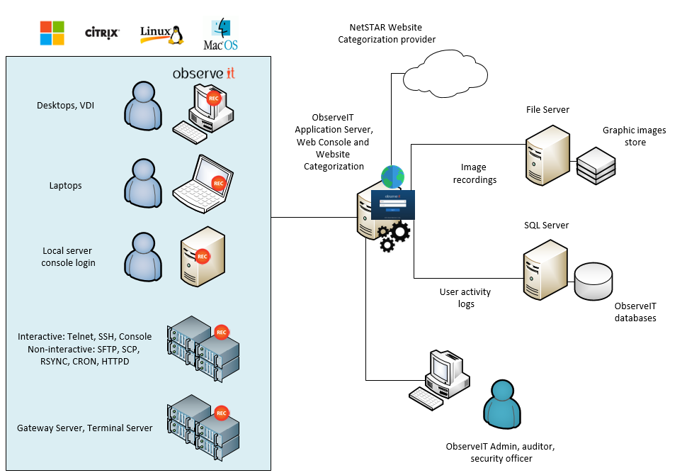 ObserveIT is a software-based user activity monitoring and internal risk identification platform with no fixed hardware components. Software Agents running on Windows, Mac, or Unix/Linux gateways, servers or desktops capture user activity data and send it to an ITM On-Prem (ObserveIT) Application Server. The Application Server sends the relevant user activity log and screen video data to a Database Server for storage. All captured user activity data can be searched for, reported on, configured for alerts, and integrated with SIEM systems. Administrators manage the system and access user activity logs, screen video, reports and other features using the ITM On-Prem Web Console, which is served by the Application Server.