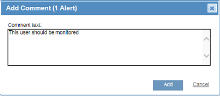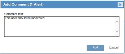 - In the Add Comment dialog box that pops up (showing the number of alerts that were selected), type your comment, and click Add. For example: