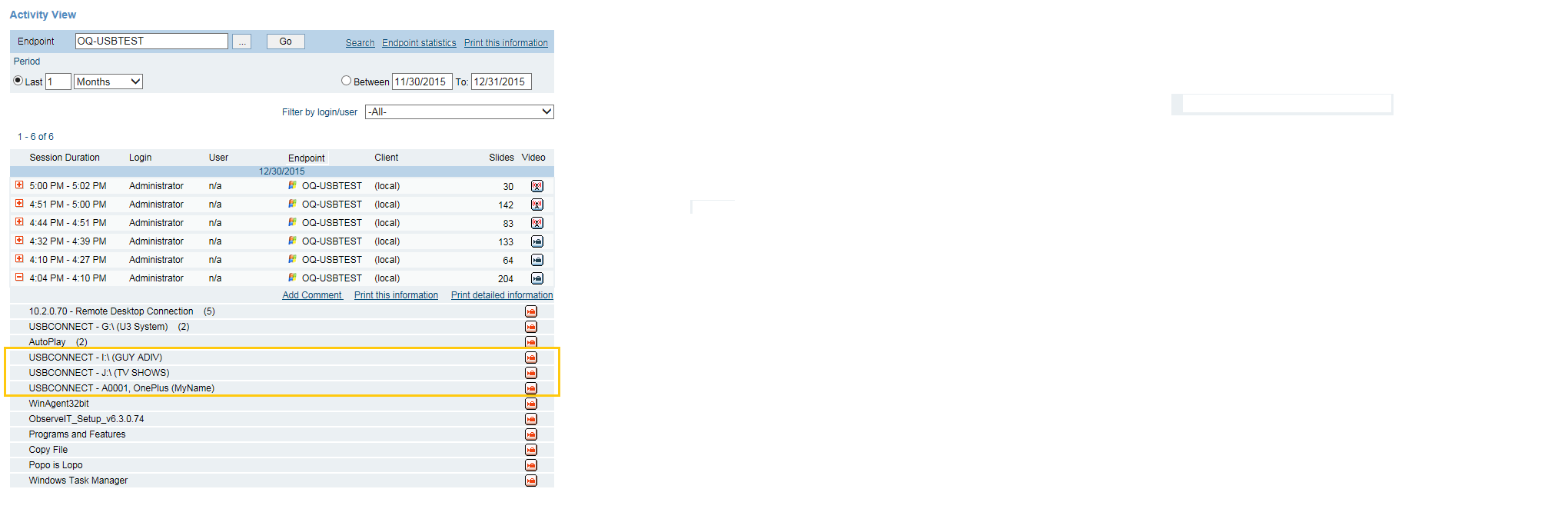 The following example shows how the detection of user actions to insert USB external storage devices are displayed in the Endpoint Diary within the ITM On-Prem Web Console.