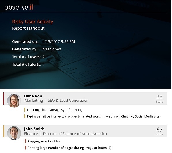 The cover page of the PDF report shows summary information about the risky user activity: