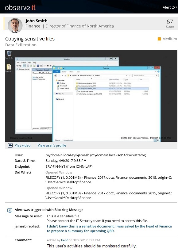 Following shows an example of how John Smith, who is the Director of Finance in his company, appears to have attempted to exfiltrate data by copying a sensitive company file. A screenshot is displayed showing the captured user activity. The alert is of medium severity (color-coded orange).