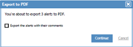 The Export to PDF dialog box pops up, showing the number of alerts that were selected. For example: