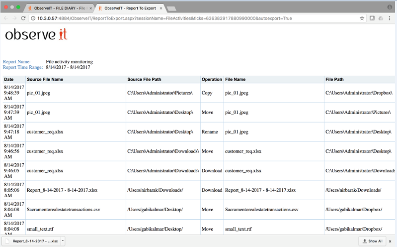 ObserveIT allows you to export to Microsoft Excel and print the metadata of all or selected file activities.