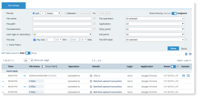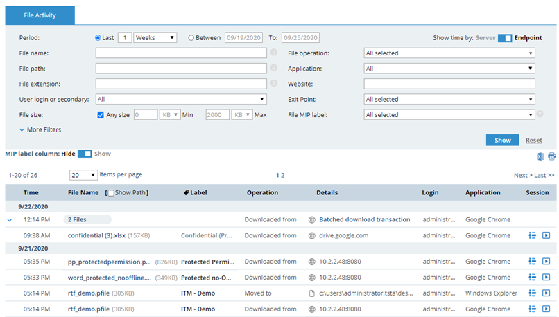 MIP labels: You can choose to show or hide MIP labels in the File Activity View. When you choose to show MIP labels, a column is added to the File Activity view.