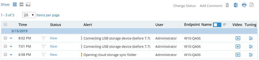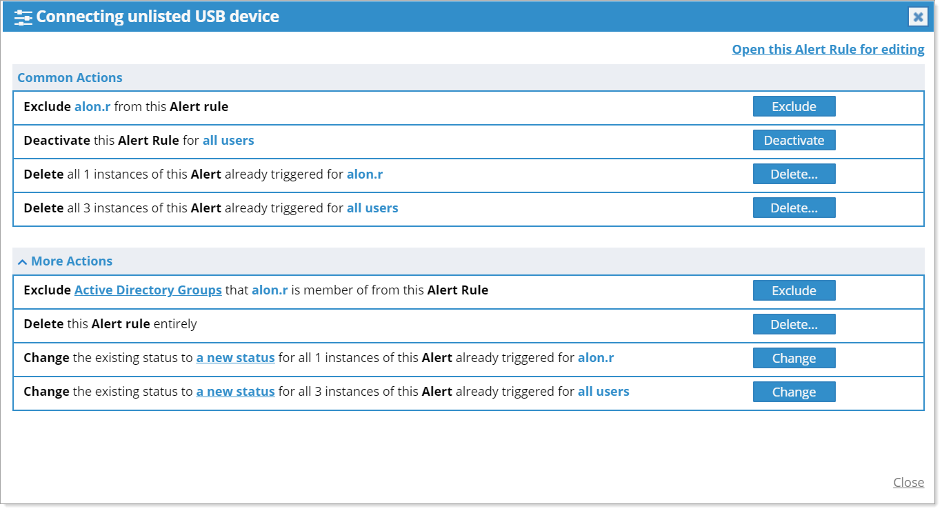 Exclude <user> from this Alert rule: The alert will no longer be triggered for the user. In the example, if alon.r connects an unlisted USB device, an alert will not trigger. An alert will trigger for other users.