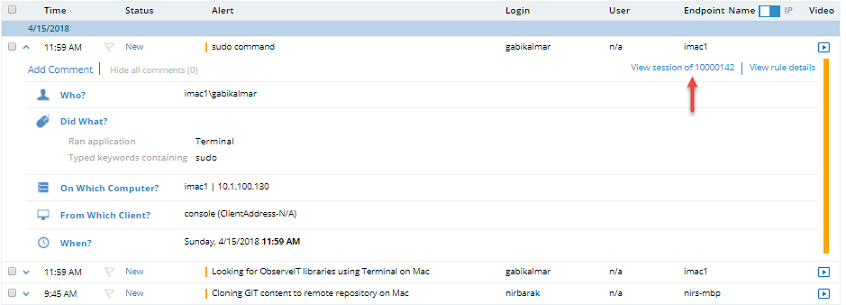 - In the Alerts page, click the View session of alert ID number link in the relevant session's details.